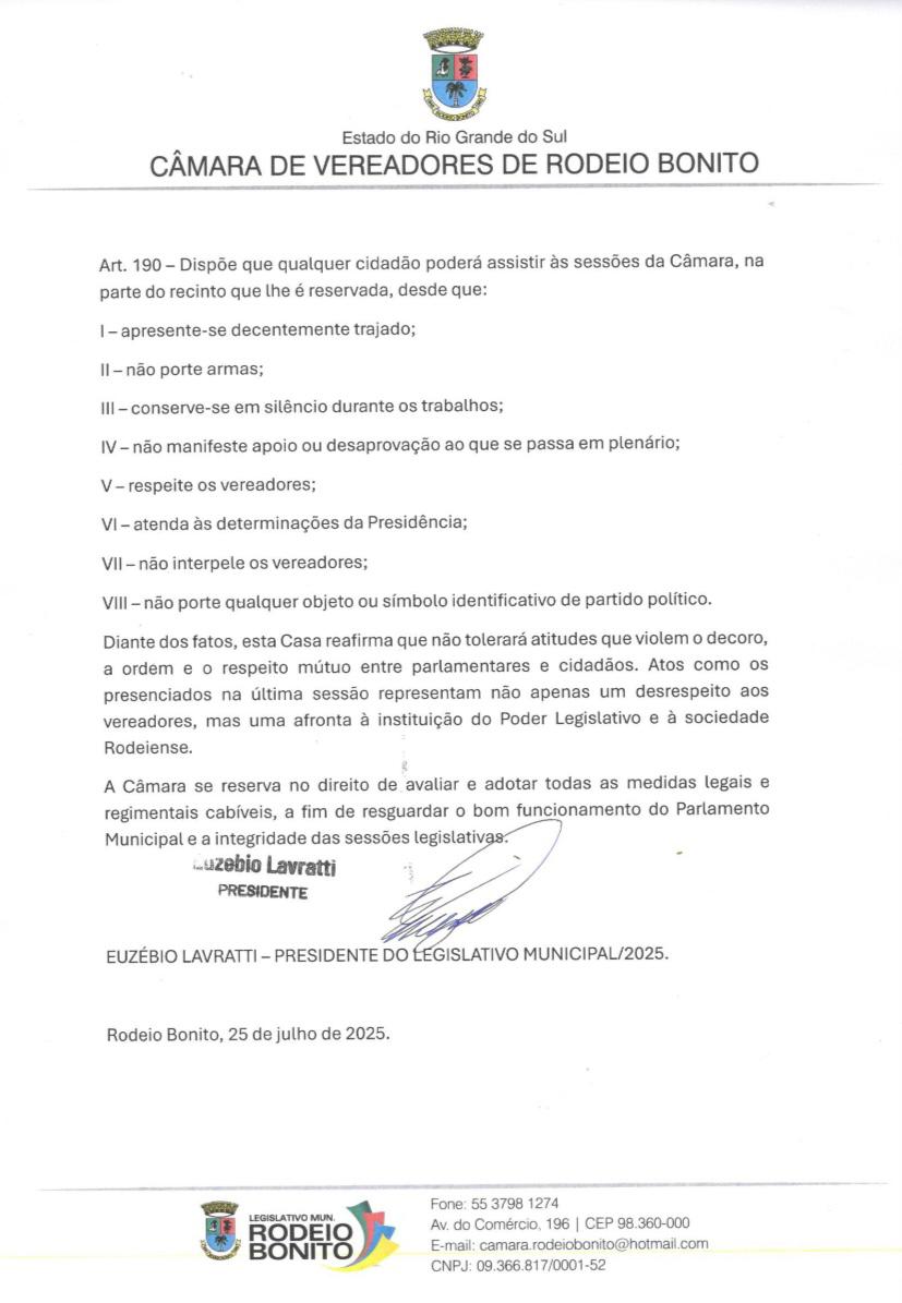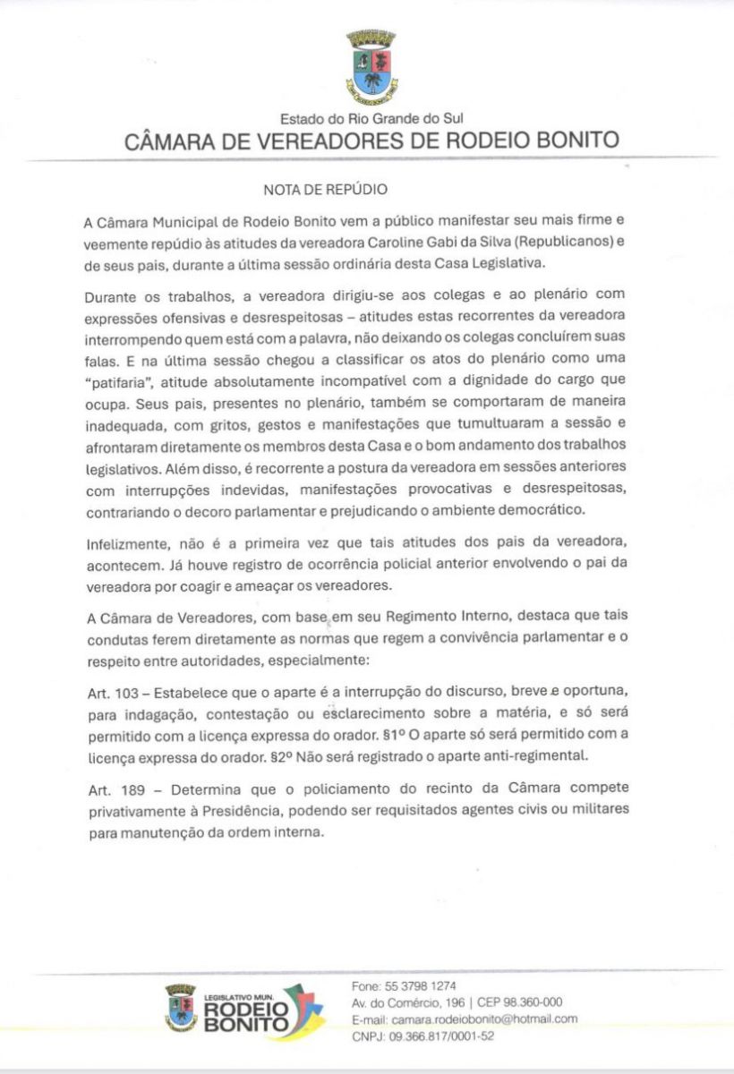 A Câmara de Vereadores de Rodeio Bonito emitiu nota de repúdio, nesta sexta-feira, 25, relacionada a atitudes de vereadora e seus pais, durante sessão na Csa Legislativa do município.